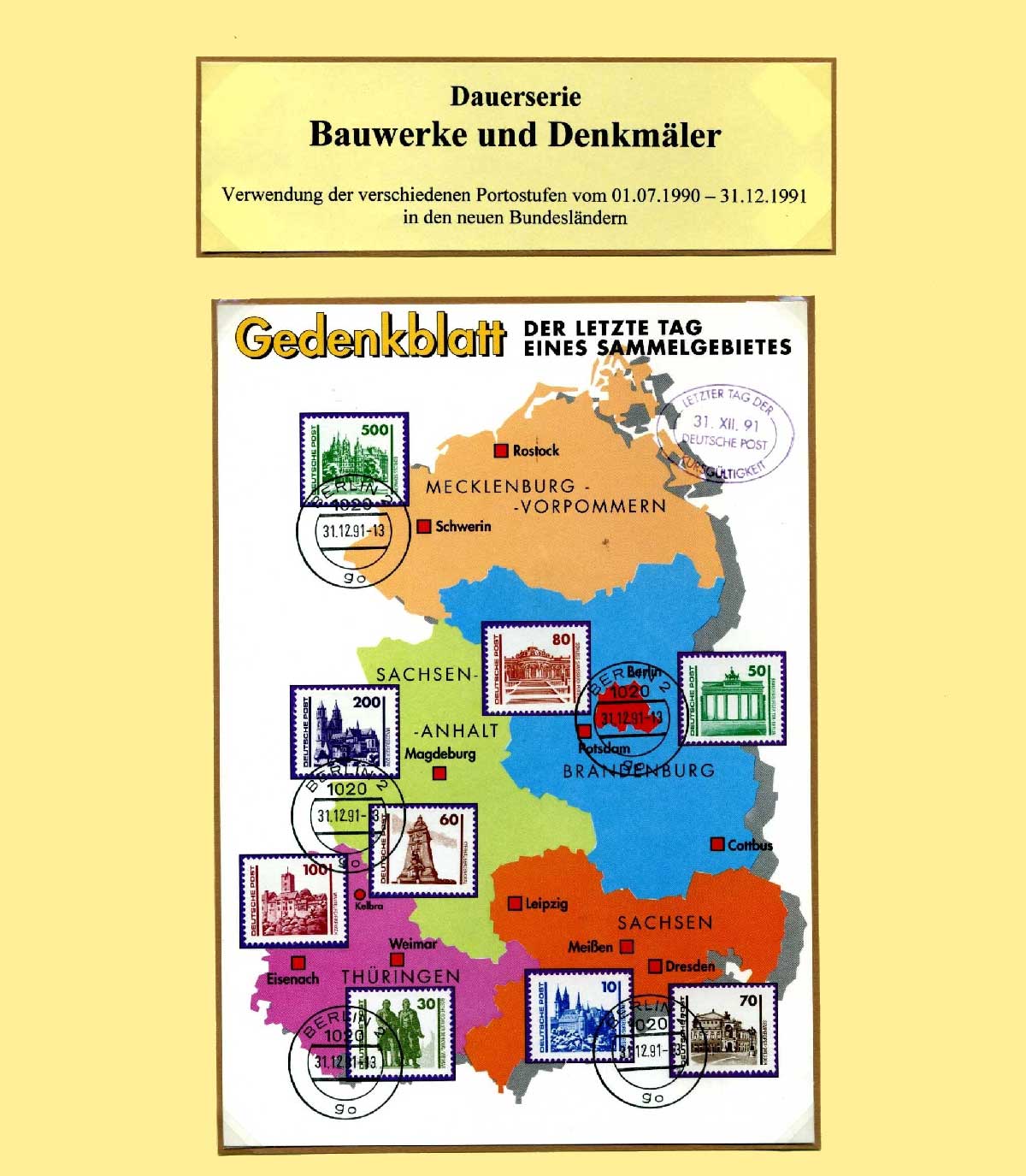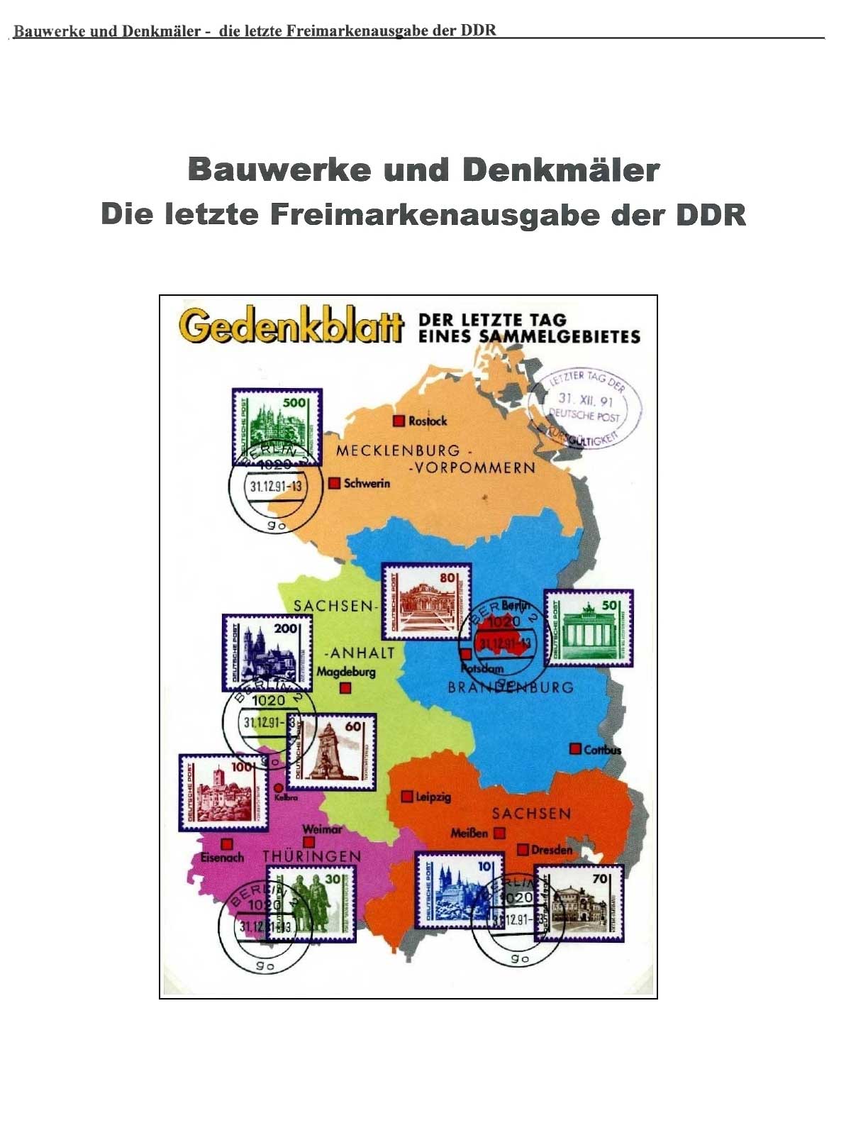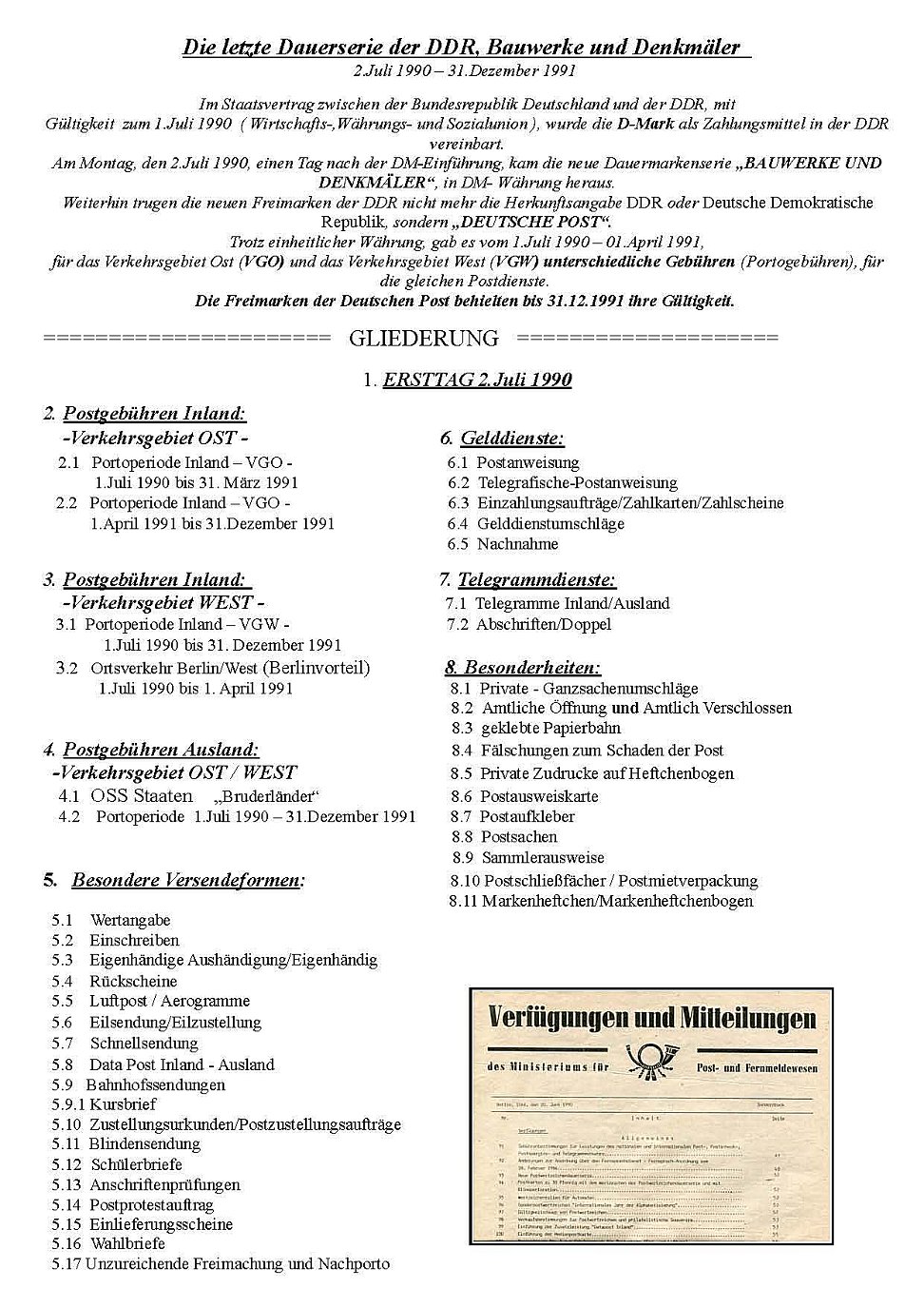 Die letzte Dauerserie der DDR, Bauwerke und Denkmäler 2.Juli 1990 – 31.Dezember 1991Im Staatsvertrag zwischen der Bundesrepublik Deutschland und der DDR, mit Gültigkeit zum 1.Juli 1990 ( Wirtschafts-,Währungs- und Sozialunion ), wurde die D-Mark als Zahlungsmittel in der DDR vereinbart. Am Montag, den 2.Juli 1990, einen Tag nach der DM-Einführung, kam die neue Dauermarkenserie “BAUWERKE UND DENKMÄLER”, in DM- Währung heraus. Weiterhin trugen die neuen Freimarken der DDR nicht mehr die Herkunftsangabe DDR oder Deutsche Demokratische Republik, sondern “DEUTSCHE POST”.Trotz einheitlicher Währung, gab es vom 1.Juli 1990 – 01.April 1991, für das Verkehrsgebiet Ost (VGO) und das Verkehrsgebiet West (VGW) unterschiedliche Gebühren (Portogebühren), für die gleichen Postdienste. Die Freimarken der Deutschen Post behielten bis 31.12.1991 ihre Gültigkeit.
