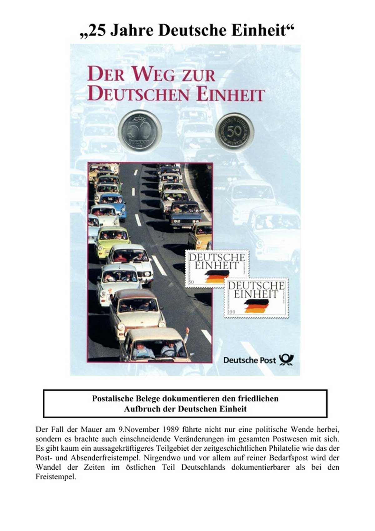 25 Jahre Deutsche Einheit - Postalische Belege dokumentieren den friedlichen Aufbruch der Deutschen EinheitDer Fall der Mauer am 9.November 1989 führte nicht nur eine politische Wende herbei, sondern es brachte auch einschneidende Veränderungen im gesamten Postwesen mit sich. Es gibt kaum ein aussagekräftigeres Teilgebiet der zeitgeschichtlichen Philatelie wie das der Post- und Absenderfreistempel. Nirgendwo und vor allem auf reiner Bedarfspost wird der Wandel der Zeiten im östlichen Teil Deutschlands dokumentierbarer als bei den Freistempel.· Teilweise werden die bisherigen Wertrahmen und Werbeklischees unverändert weiter verwendet. |