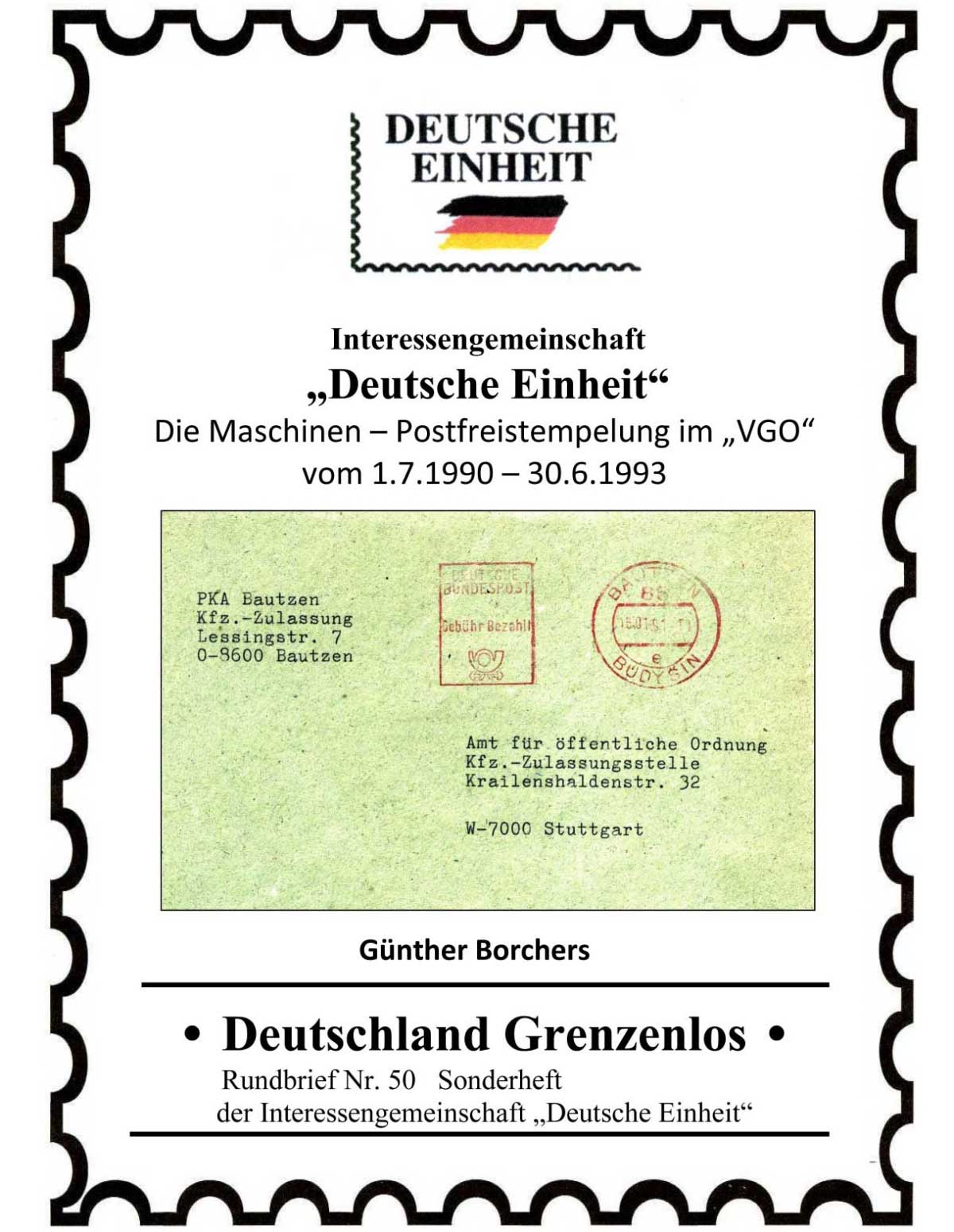 Die Maschinen-Postfreistempelung im “VGO” vom 1.7.1990 bis 30.6.1993Die Darstellung ist eine Zusammenfassung über die Postfreistempelung vom 1.Juli 1990 bis 30.Juni 1993 in den neuen Bundesländern (VGO = Verkehrsgebiet Ost).Nach dem am 1.7.1990 die Währungsunion mit der Bundesrepublik Deutschland wirksam wurde, wurde bei der Wiedervereinigung am 3.10.1990 die Post der DDR durch die Deutsche Bundespost übernommen. Von da an galten die Geschäftsbedingungen der Deutschen Bundespost. Mit der Übernahme der Posthoheit in den neuen Bundesländern gab es im Bundesgebiet zwei verschiedene Tarifgebiete mit verschiedenen Postleitzahlengebieten. Hier durch hatten ca. 800 Orte die gleichen Postleitzahlen. Mit Einführung der fünfstelligen Postleitzahl zum 1.Juli 1993 endet ein spannender Zeitabschnitt. Dieser soll in der vorliegenden Arbeit aufgearbeitet werden. Die Bezeichnung der Wertstempel richten sich nach dem Handbuch und Katalog der deutschen Post- und Absenderfreistempel von Heiner Dürst und Gerd Eich von 1980. |