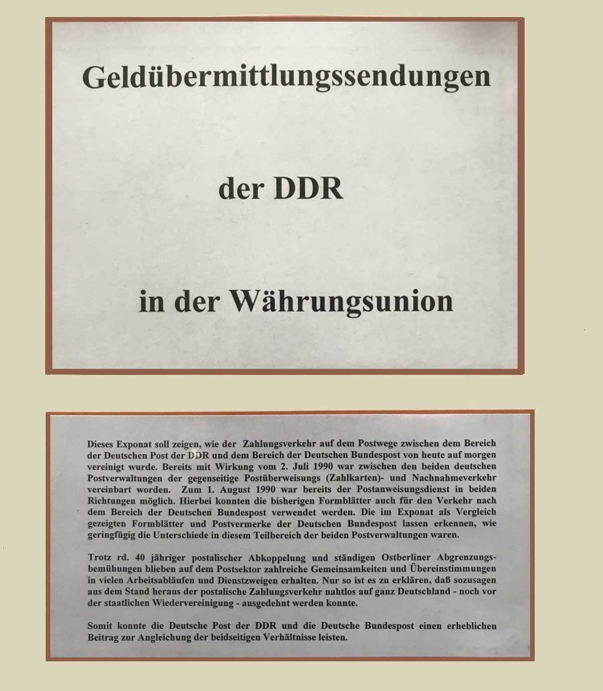 Geldübermittlungssendungen der DDR in der WährungsunionNach dem am 1.7.1990 die Währungsunion mit der Bundesrepublik Deutschland wirksam wurde, wurde bei der Wiedervereinigung am 3.10.1990 die Post der DDR durch die DeutscDieses Exponat soll zeigen, wie der Zahlungsverkehr auf dem Postwege zwischen dem Bereich der Deutschen Post der DDR und dem Bereich der Deutschen Bundespost von heute auf morgen vereinigt wurde. Bereits mit Wirkung vom 2. Juli 1990 war zwischen den beiden deutschen Postverwaltungen der gegenseitige Postüberweisungs- (Zahlkarten-) und Nachnahmeverkehr vereinbart worden. Zum 1. August 1990 war bereits der Postanweisungsdienst in beiden Richtungen möglich. Hierbei konnten die bisherigen Formblätter auch für den Verkehr nach dem Bereich der Deutschen Bundespost verwendet werden. Die im Exponat als Vergleich gezeigten Formblätter und Postvermerke der Deutschen Bundespost lassen erkennen, wie geringfügig die Unterschiede in diesem Teilbereich der beiden Postverwaltungen waren. Trotz rd. 40 jähriger postalischer Abkoppelung und ständigen Ostberliner Abgrenzungsbemühungen blieben auf dem Postsektor zahlreiche Gemeinsamkeiten und Übereinstimmungen in vielen Arbeitsabläufen und Dienstzweigen erhalten. Nur so ist es zu erklären, dass sozusagen aus dem Stand heraus der postalische Zahlungsverkehr nahtlos auf ganz Deutschland - noch vor der staatlichen Wiedervereinigung - ausgedehnt werden konnte. Somit konnte die Deutsche Post der DDR und die Deutsche Bundespost einen erheblichen Beitrag zur Angleichung der beidseitigen Verhältnisse leisten. |