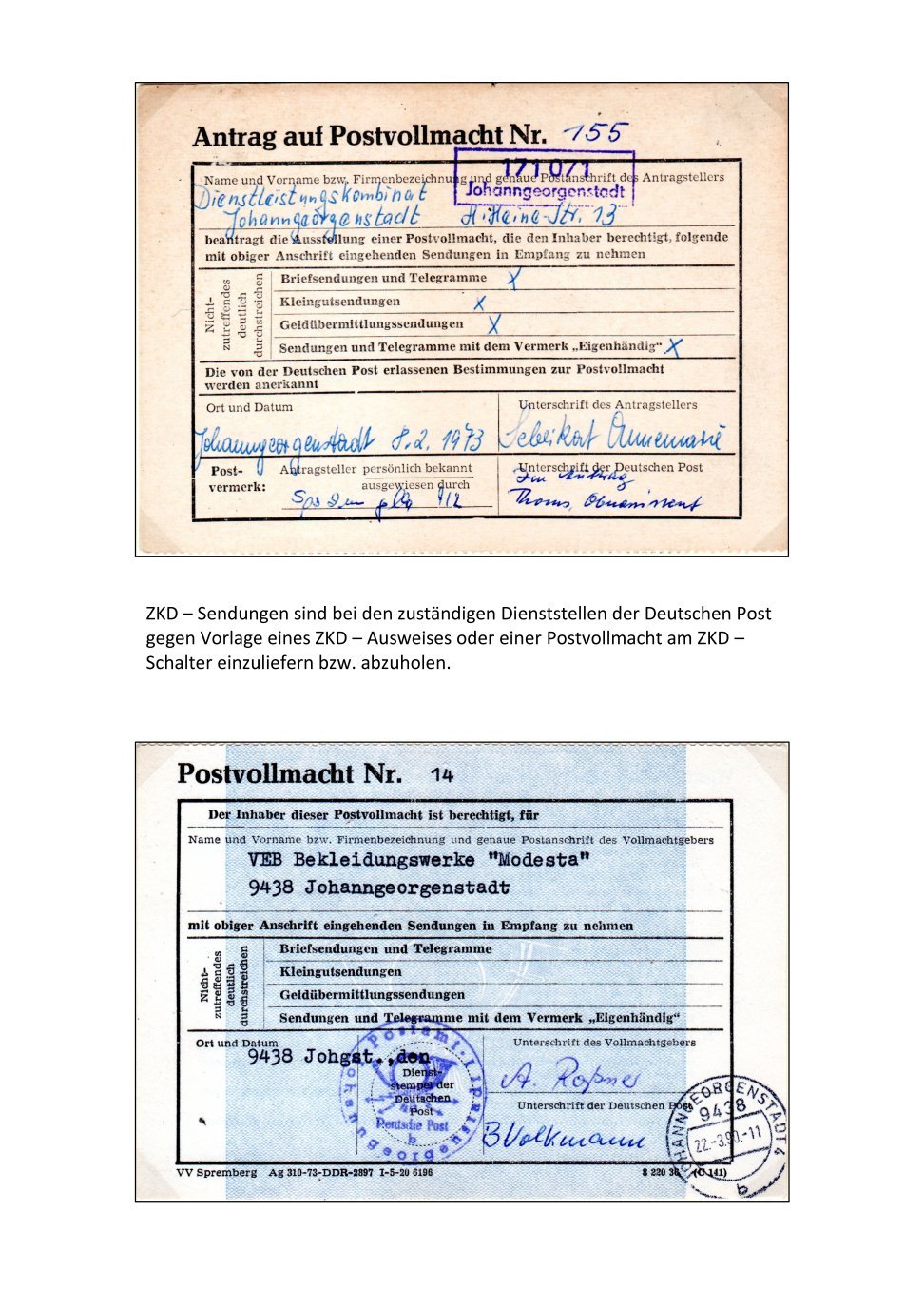 Die letzten Züge des Zentralen Kurierdienstes (ZKD)Entsprechend einer Verfügung vom 18.April 1990 wurde der Zentrale Kurierdienst ab 1.Mai 1990 unter Beibehaltung der Strukturen und Gewährleistung der Laufzeit vollständig der Deutschen Post unterstellt. Gleichzeitig wurden aufwandsdeckende Gebühren eingeführt.Die Art und Weise der Gebührenentrichtung bzw. Freimachung durch Absenderfreistempler blieben unverändert. Die Inanspruchnahme der Zusatzleistung "Zentraler Kurierdienst" war nicht mehr vorgeschrieben, sondern durch die Staatsorgane und Betriebe in eigener Zuständigkeit zu entscheiden. Die Anbringung des Vermerks "Persönlich" war nicht mehr zulässig. Schließlich wurde durch Verfügung vom 20.Juni 1990 der Zentrale Kurierdienst ab 1.Juli 1990 eingestellt. Die gezeigte Ausstellungssammlung "Die letzten Züge des Zentralen Kurierdienstes (ZKD)" können Sie im Tausch oder Kauf übernehmen. Zu der Sammlung gehören noch 100 weitere Briefe die hier nicht gezeigt werden können. Dazu kommen noch 2 ZKD Ausgangsbücher und 1 ZKD Eingangsbuch. Informationen erhalten Sie bei der Rundbrief-Redaktion. |