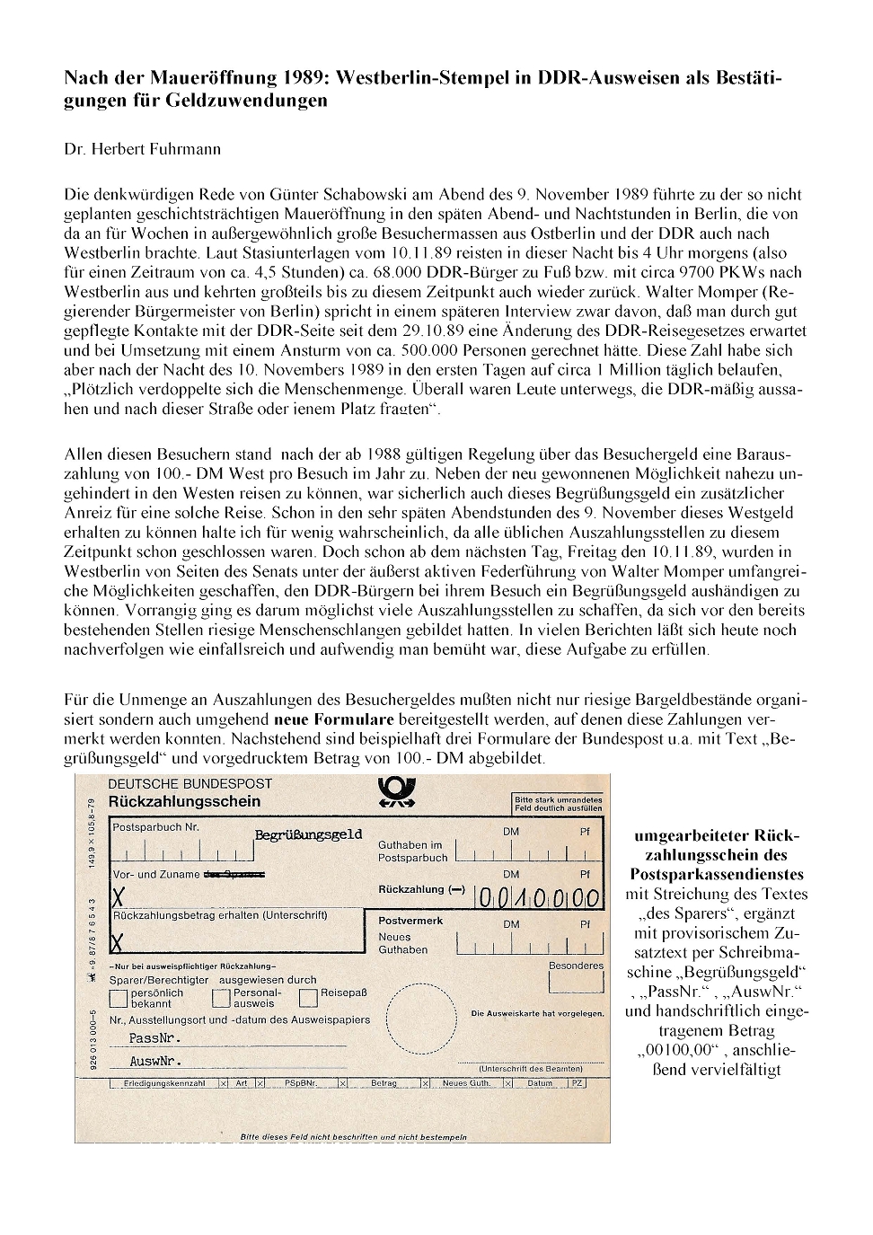 Allen Besuchern stand nach der ab 1988 gültigen Regelung über das Besuchergeld eine Barauszahlung von 100.- DM West pro Besuch im Jahr zu. Neben der neu gewonnenen Möglichkeit nahezu ungehindert in den Westen reisen zu können, war sicherlich auch dieses Begrüßungsgeld ein zusätzlicher Anreiz für eine solche Reise. |