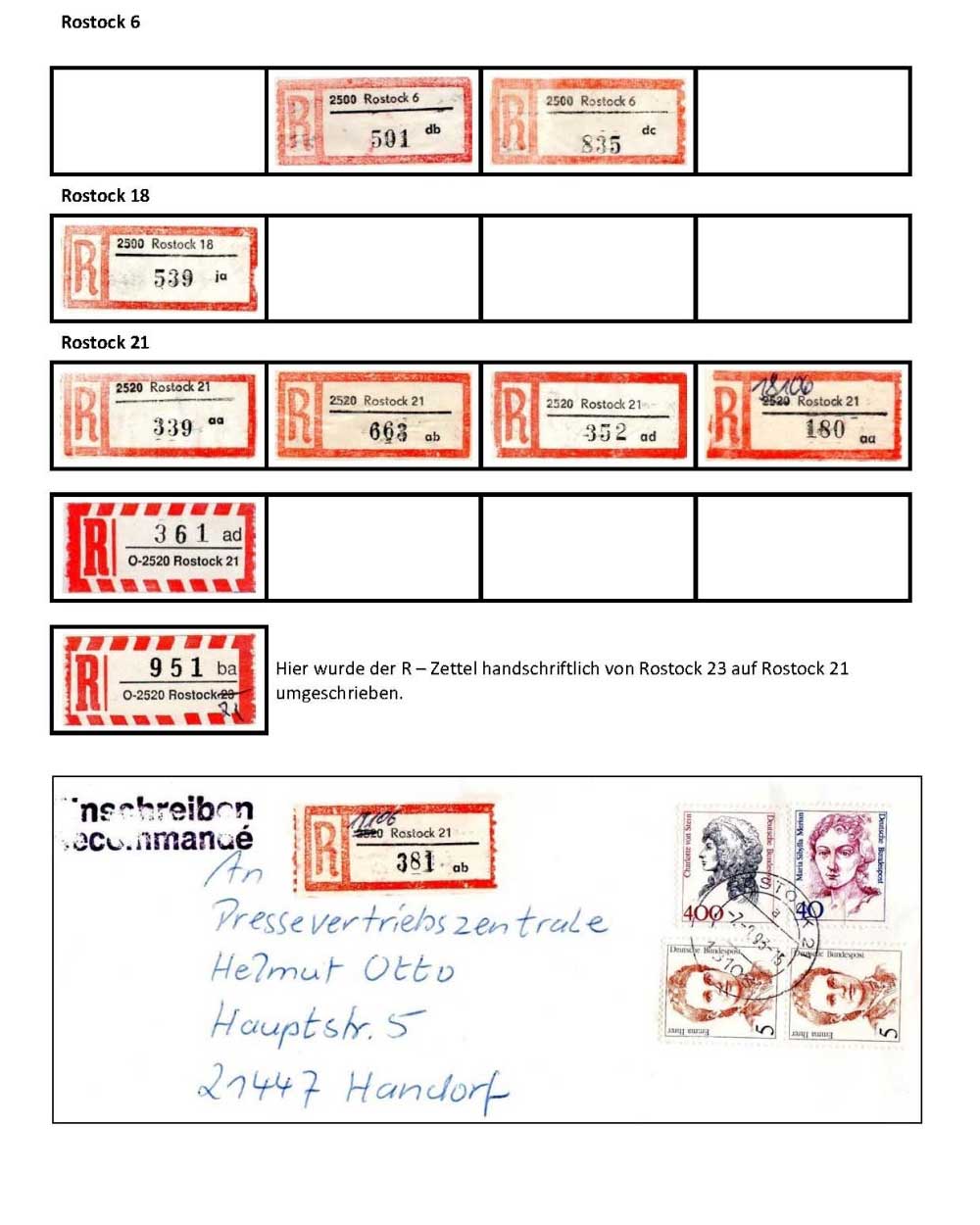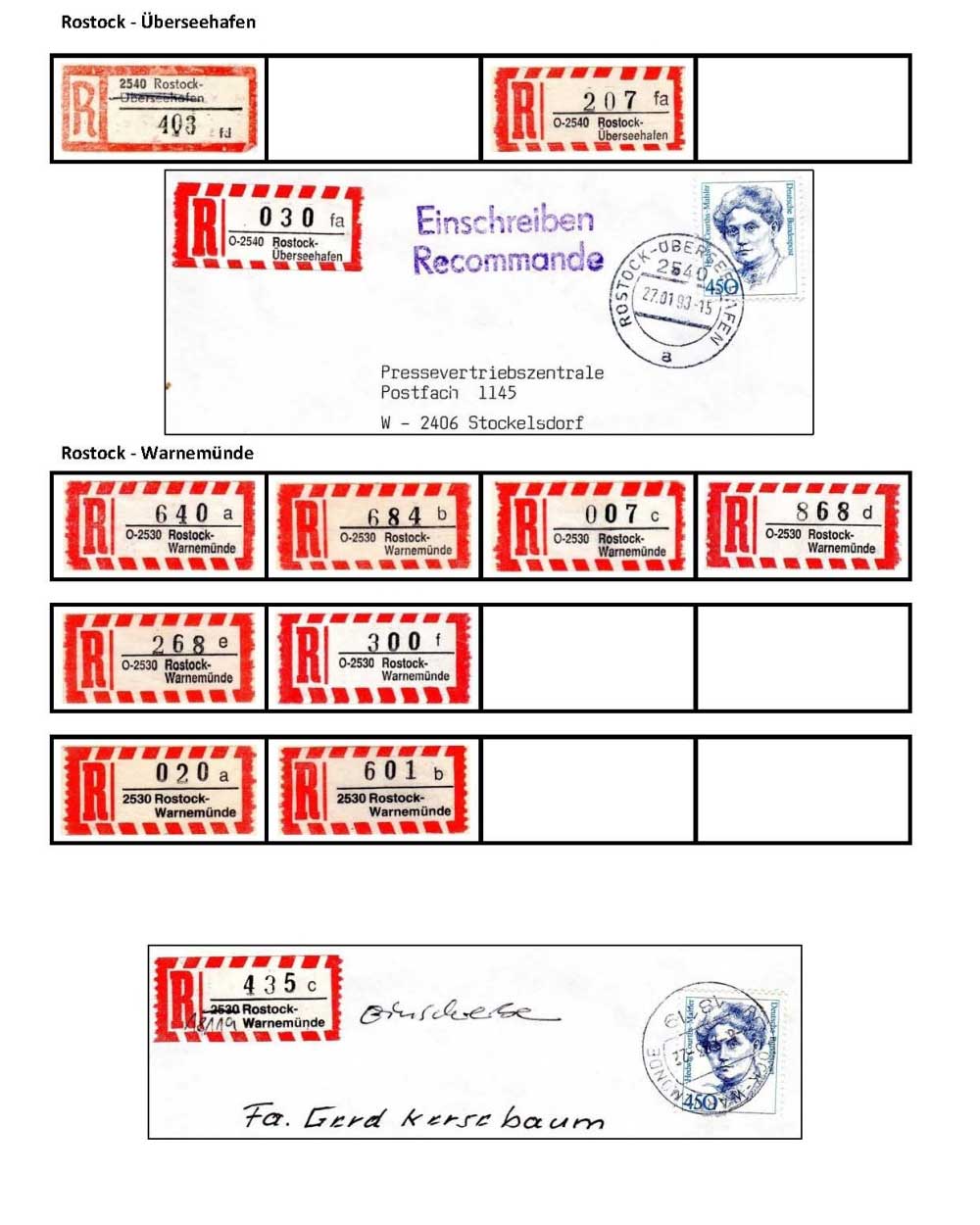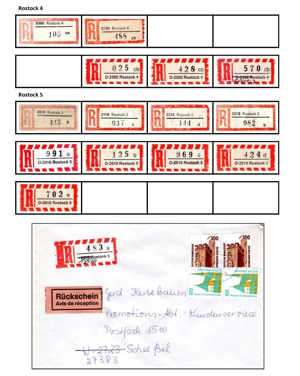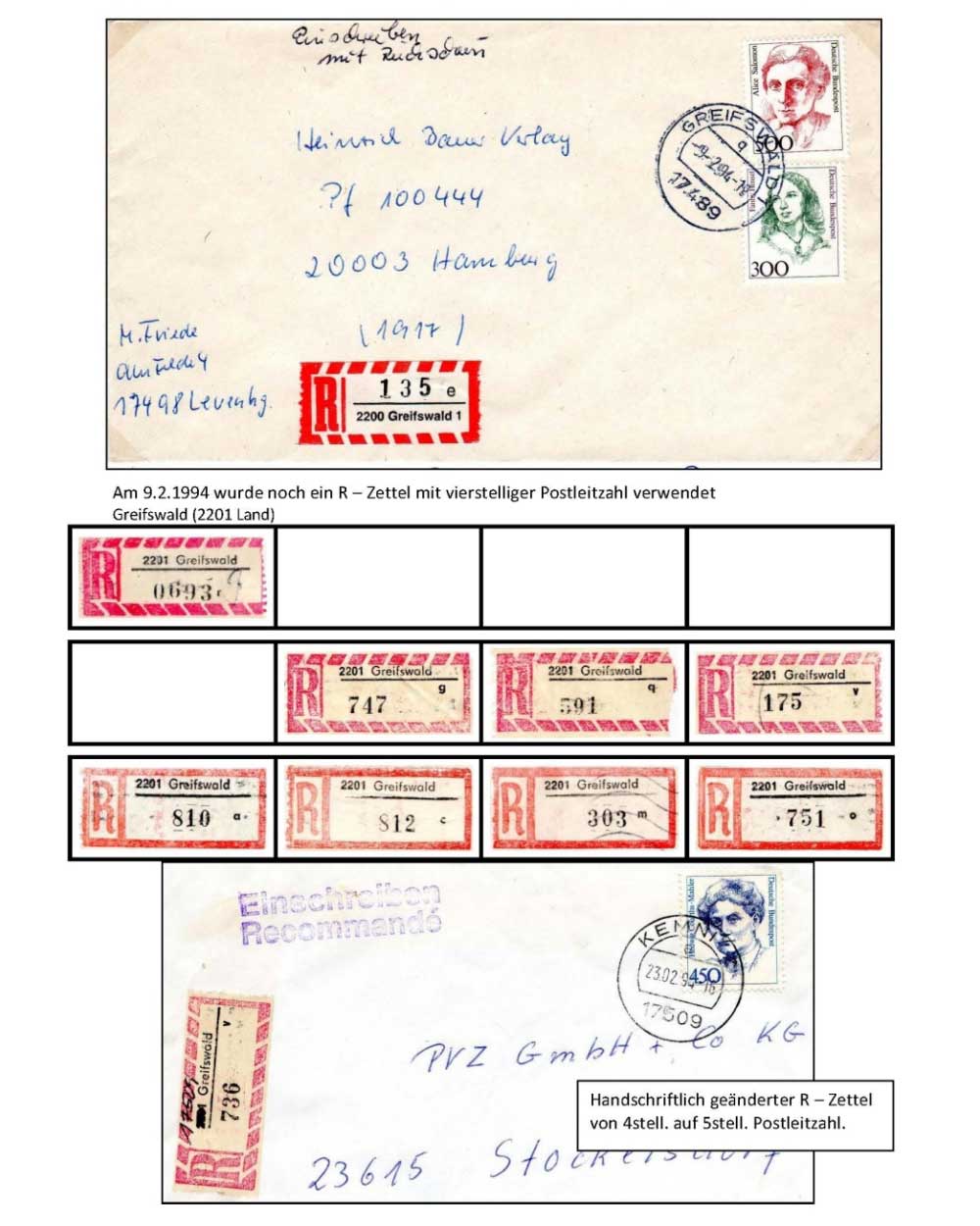 Einschreibbriefe dokumentieren den postalischen Weg zur “Deutschen Einheit”Nachdem am 9.11.1989 die Grenzübergänge der DDR zur Bundesrepublik Deutschland geöffnet wurden, eröffnete sich für die Zeitungsverlage ein großer Markt. Die ersten zwei Jahre nach dem Fall der Mauer reisten die Drücker–Kolonnen aus dem Westen in die neuen Bundesländer um ihre Zeitschriftenabos an die Bürger der ehemaligen DDR zu verkaufen. Die Menschen hatten einen großen Nachholbedarf und schlossen bereitwillig die Verträge über mehrere Zeitschriften ab. Nachdem sie Zuhause das Kleingedruckte durch gelesen hatten, begann die große Kündigungsflut. Auf diese Flut von Kündigungen war die Deutsche Post nicht eingestellt. Durch die Fehleinschätzung kam es zu einen Engpass bei den Formularen und Einschreibezetteln. Aus dieser Not befreite man sich, indem man alte R–Zettel, blanko R–Zettel und von anderen Postämtern zweckentfremdete. Dadurch kam es zu vielen Besonderheiten und Raritäten. Nachfolgend ein kleiner Überblick über die verwendeten R–Zettel im genannten Zeitraum. Diese Ausarbeitung erhebt keinen Anspruch auf Vollständigkeit. Bei den R–Zettel gibt es bestimmt noch andere Varianten die noch nicht bekannt sind. Bitte melden Sie alles!!! Ortsauflistung der einzelnen Varianten, Besonderheiten - Scan oder Kopie genügt. eMail: borchers.sauensiek@online.de Sie können jede einzelne Seite bei Bedarf durch anklicken in einem eigenen Fenster vergrößern!! |