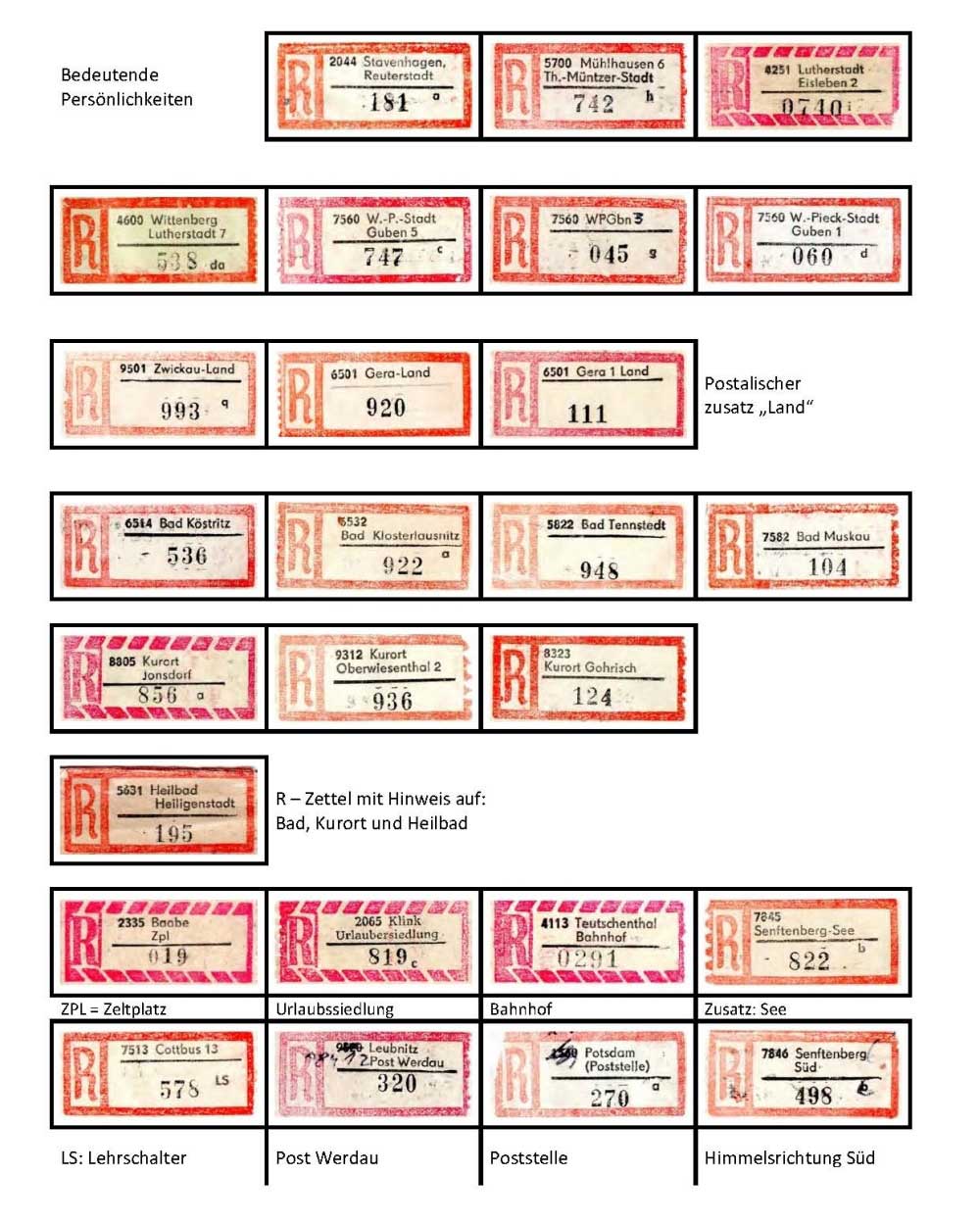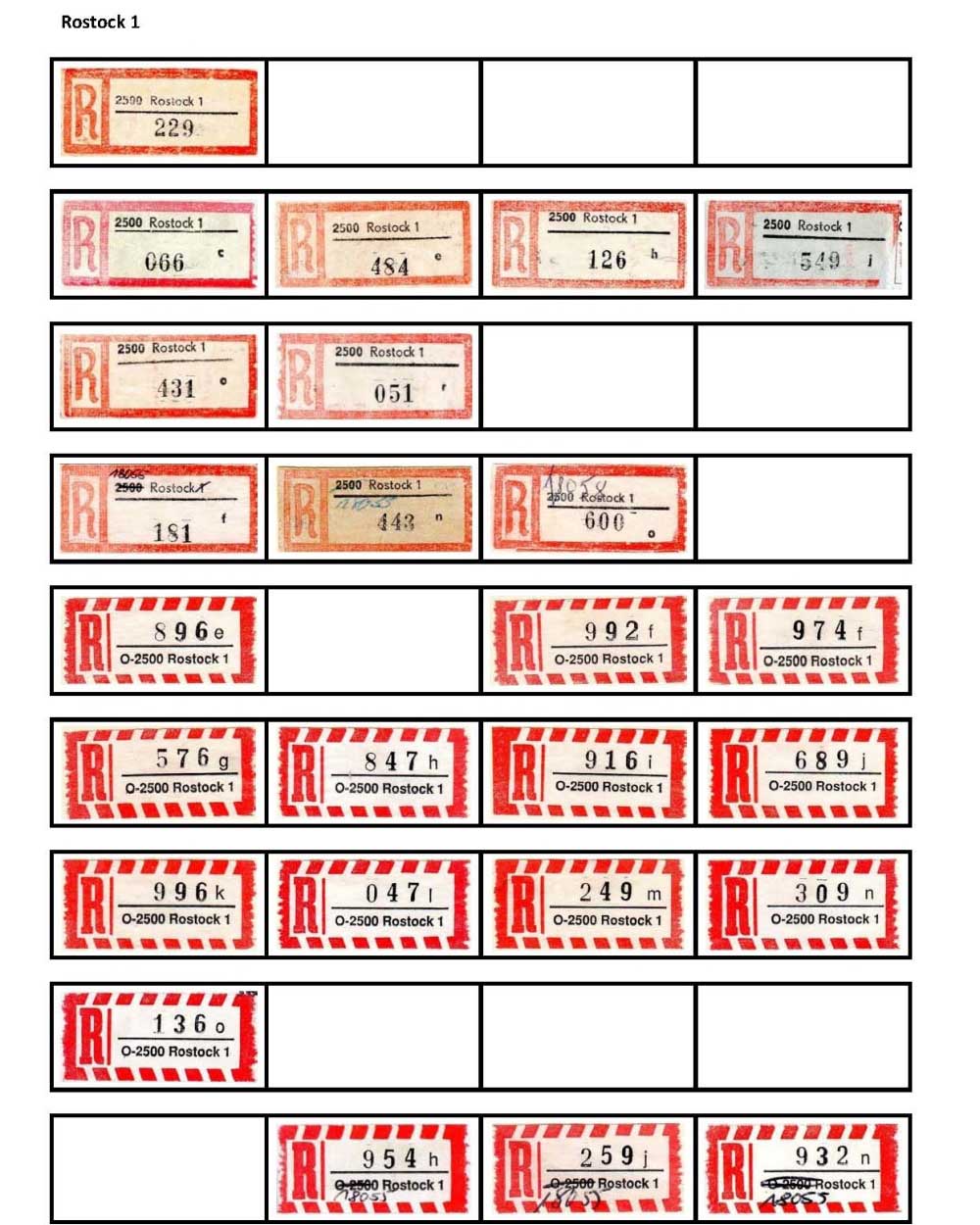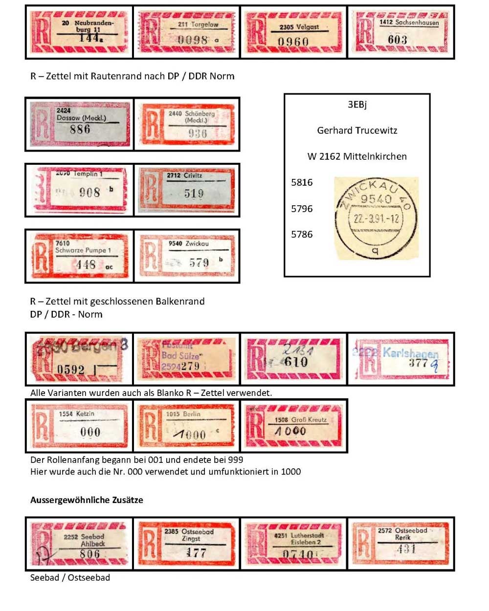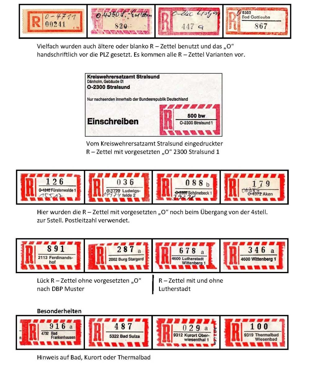 Einschreibbriefe dokumentieren den postalischen Weg zur “Deutschen Einheit”Nachdem am 9.11.1989 die Grenzübergänge der DDR zur Bundesrepublik Deutschland geöffnet wurden, eröffnete sich für die Zeitungsverlage ein großer Markt. Die ersten zwei Jahre nach dem Fall der Mauer reisten die Drücker–Kolonnen aus dem Westen in die neuen Bundesländer um ihre Zeitschriftenabos an die Bürger der ehemaligen DDR zu verkaufen. Die Menschen hatten einen großen Nachholbedarf und schlossen bereitwillig die Verträge über mehrere Zeitschriften ab. Nachdem sie Zuhause das Kleingedruckte durch gelesen hatten, begann die große Kündigungsflut. Auf diese Flut von Kündigungen war die Deutsche Post nicht eingestellt. Durch die Fehleinschätzung kam es zu einen Engpass bei den Formularen und Einschreibezetteln. Aus dieser Not befreite man sich, indem man alte R–Zettel, blanko R–Zettel und von anderen Postämtern zweckentfremdete. Dadurch kam es zu vielen Besonderheiten und Raritäten. Nachfolgend ein kleiner Überblick über die verwendeten R–Zettel im genannten Zeitraum. Diese Ausarbeitung erhebt keinen Anspruch auf Vollständigkeit. Bei den R–Zettel gibt es bestimmt noch andere Varianten die noch nicht bekannt sind. Bitte melden Sie alles!!! Ortsauflistung der einzelnen Varianten, Besonderheiten - Scan oder Kopie genügt. eMail: borchers.sauensiek@online.de Sie können jede einzelne Seite bei Bedarf durch anklicken in einem eigenen Fenster vergrößern!! |