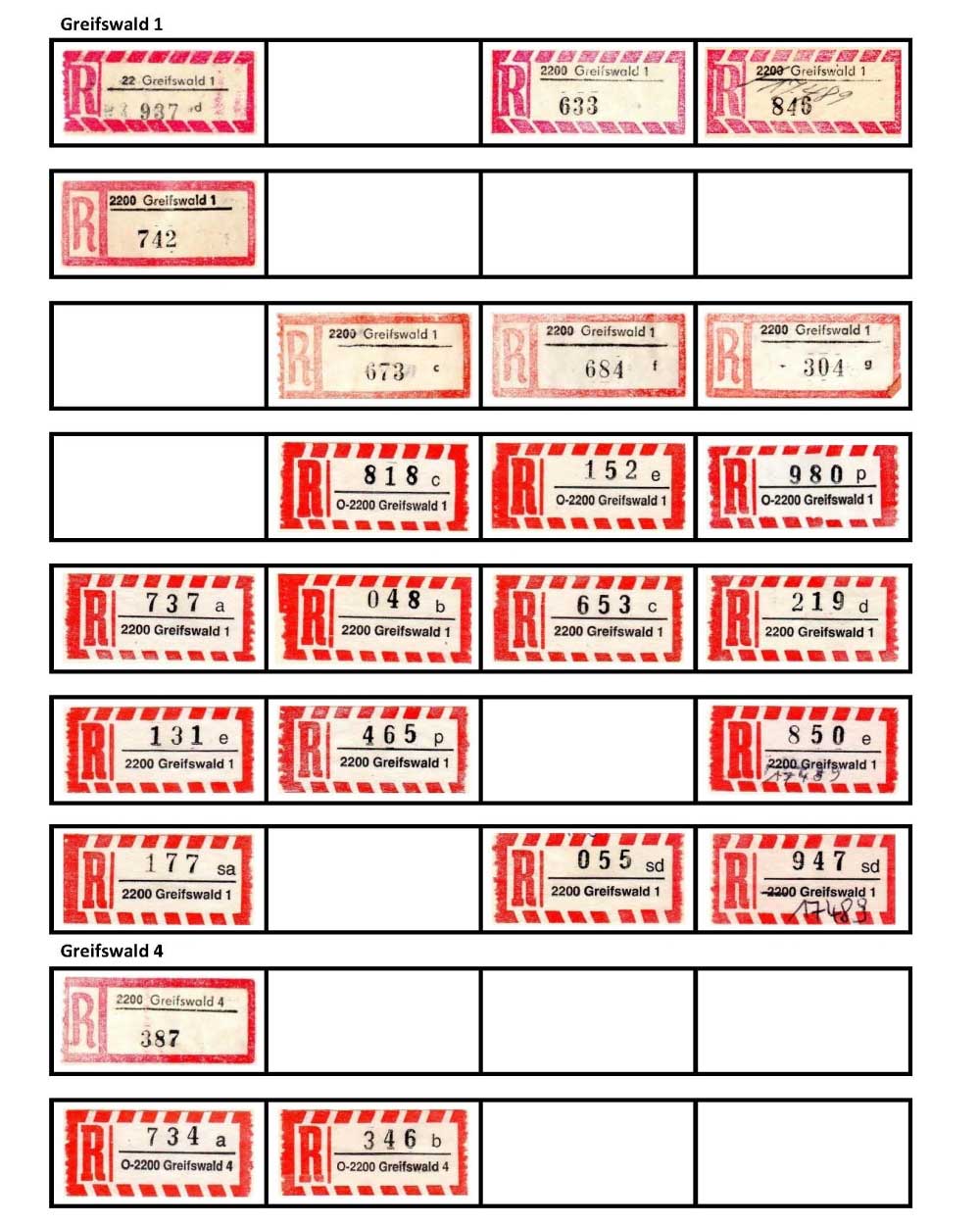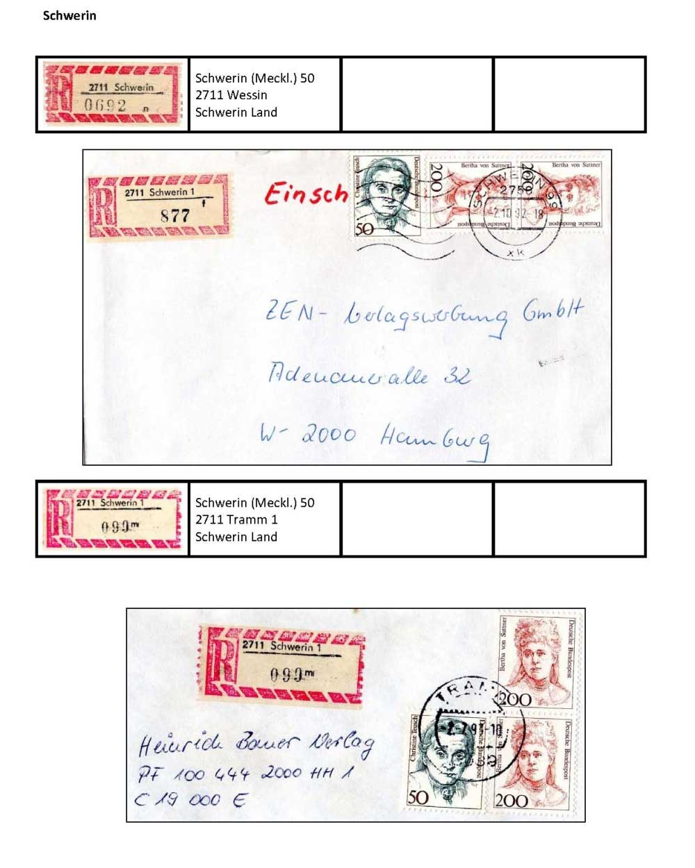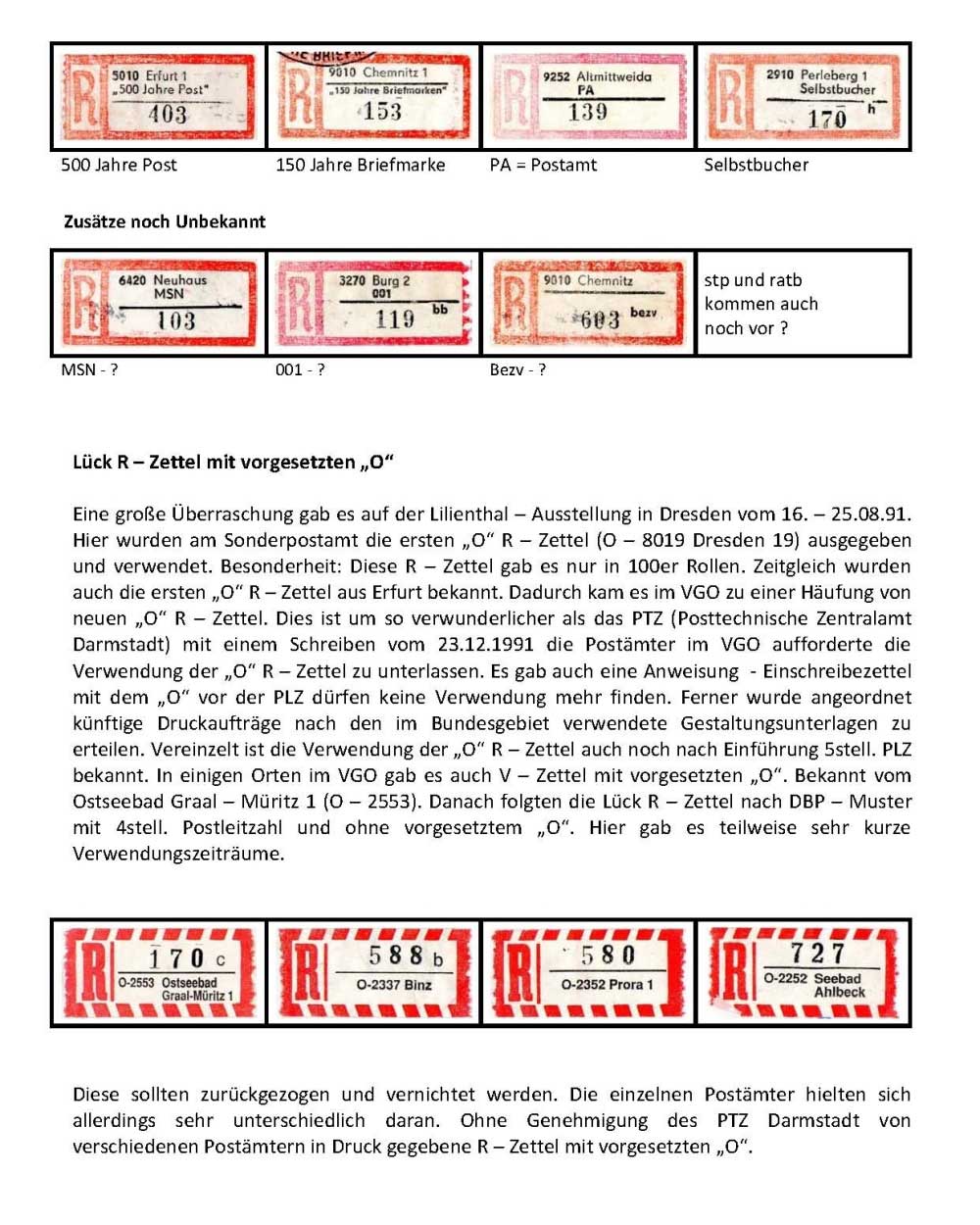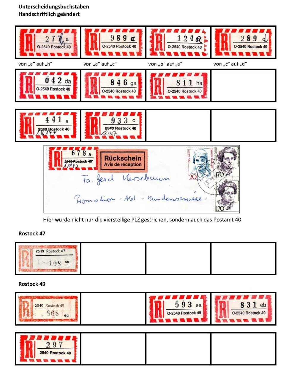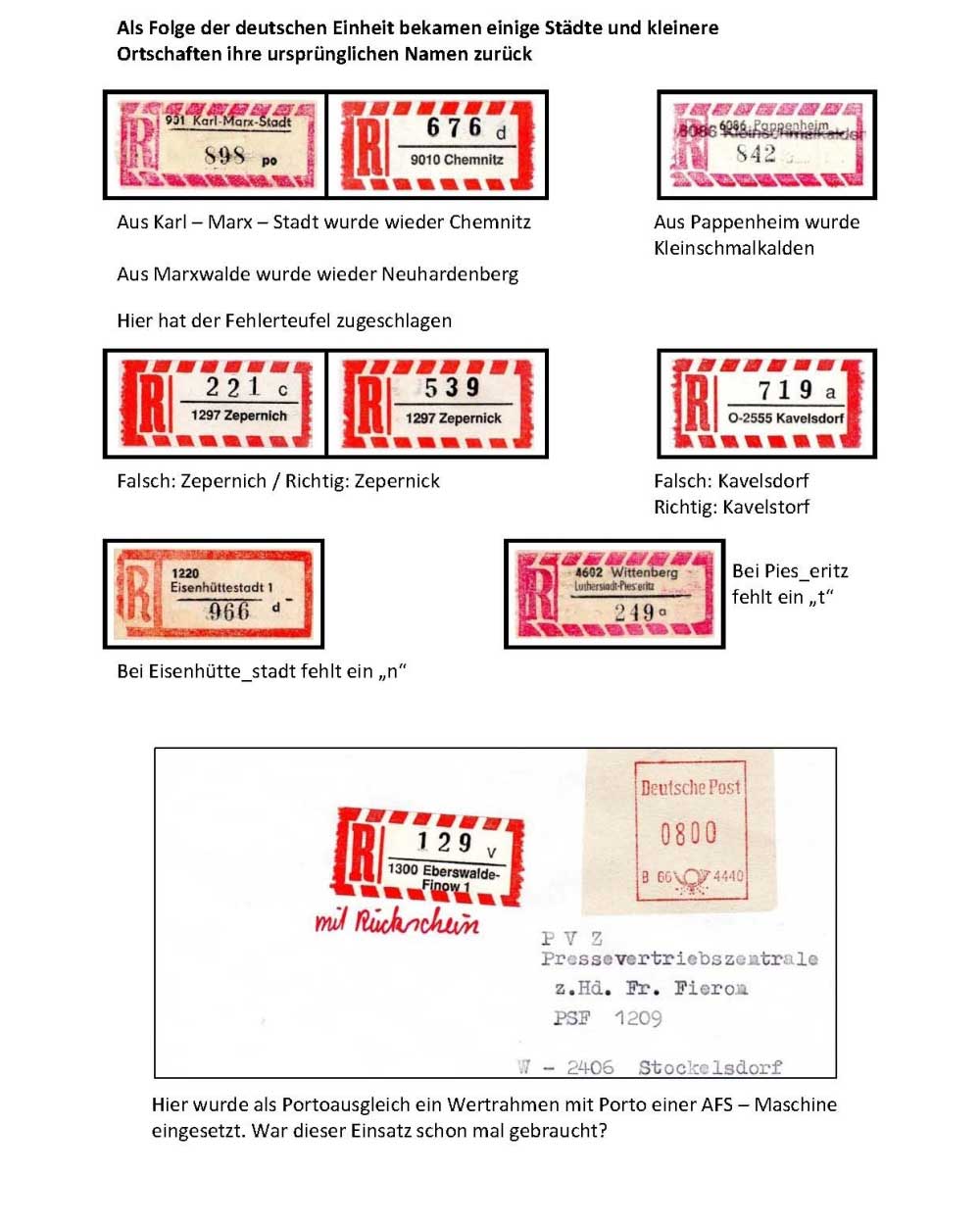 Einschreibbriefe dokumentieren den postalischen Weg zur “Deutschen Einheit”Nachdem am 9.11.1989 die Grenzübergänge der DDR zur Bundesrepublik Deutschland geöffnet wurden, eröffnete sich für die Zeitungsverlage ein großer Markt. Die ersten zwei Jahre nach dem Fall der Mauer reisten die Drücker–Kolonnen aus dem Westen in die neuen Bundesländer um ihre Zeitschriftenabos an die Bürger der ehemaligen DDR zu verkaufen. Die Menschen hatten einen großen Nachholbedarf und schlossen bereitwillig die Verträge über mehrere Zeitschriften ab. Nachdem sie Zuhause das Kleingedruckte durch gelesen hatten, begann die große Kündigungsflut. Auf diese Flut von Kündigungen war die Deutsche Post nicht eingestellt. Durch die Fehleinschätzung kam es zu einen Engpass bei den Formularen und Einschreibezetteln. Aus dieser Not befreite man sich, indem man alte R–Zettel, blanko R–Zettel und von anderen Postämtern zweckentfremdete. Dadurch kam es zu vielen Besonderheiten und Raritäten. Nachfolgend ein kleiner Überblick über die verwendeten R–Zettel im genannten Zeitraum. Diese Ausarbeitung erhebt keinen Anspruch auf Vollständigkeit. Bei den R–Zettel gibt es bestimmt noch andere Varianten die noch nicht bekannt sind. Bitte melden Sie alles!!! Ortsauflistung der einzelnen Varianten, Besonderheiten - Scan oder Kopie genügt. eMail: borchers.sauensiek@online.de Sie können jede einzelne Seite bei Bedarf durch anklicken in einem eigenen Fenster vergrößern!! |