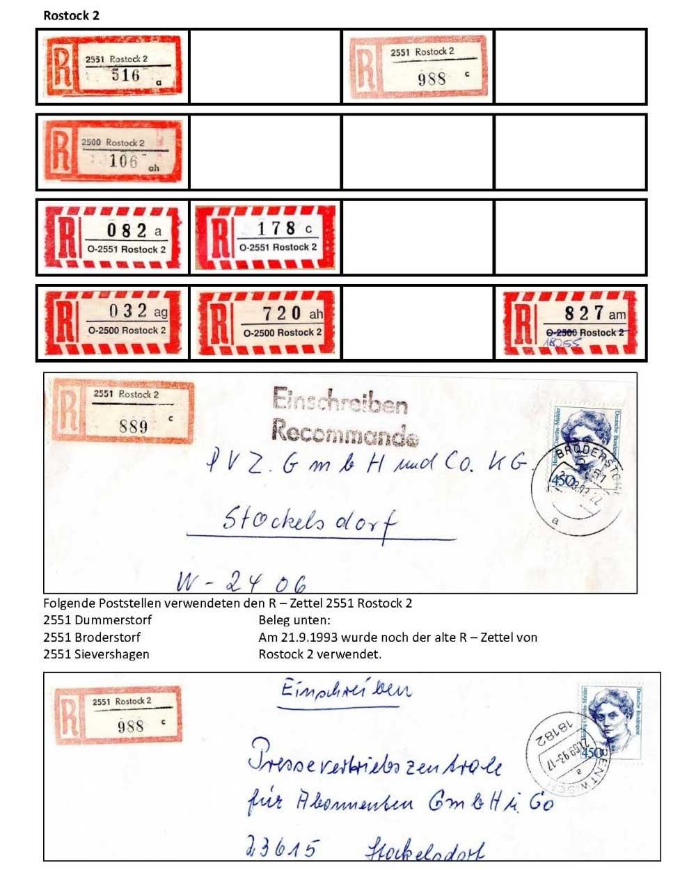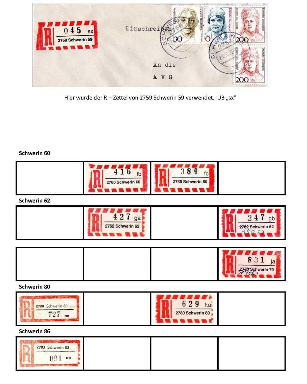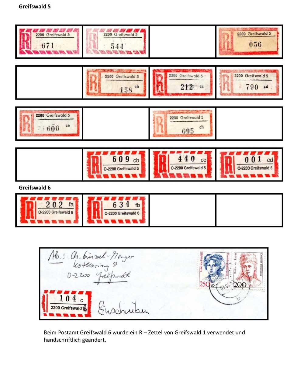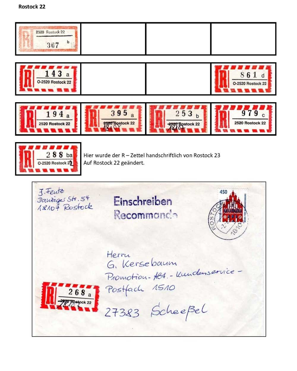 Einschreibbriefe dokumentieren den postalischen Weg zur “Deutschen Einheit”Nachdem am 9.11.1989 die Grenzübergänge der DDR zur Bundesrepublik Deutschland geöffnet wurden, eröffnete sich für die Zeitungsverlage ein großer Markt. Die ersten zwei Jahre nach dem Fall der Mauer reisten die Drücker–Kolonnen aus dem Westen in die neuen Bundesländer um ihre Zeitschriftenabos an die Bürger der ehemaligen DDR zu verkaufen. Die Menschen hatten einen großen Nachholbedarf und schlossen bereitwillig die Verträge über mehrere Zeitschriften ab. Nachdem sie Zuhause das Kleingedruckte durch gelesen hatten, begann die große Kündigungsflut. Auf diese Flut von Kündigungen war die Deutsche Post nicht eingestellt. Durch die Fehleinschätzung kam es zu einen Engpass bei den Formularen und Einschreibezetteln. Aus dieser Not befreite man sich, indem man alte R–Zettel, blanko R–Zettel und von anderen Postämtern zweckentfremdete. Dadurch kam es zu vielen Besonderheiten und Raritäten. Nachfolgend ein kleiner Überblick über die verwendeten R–Zettel im genannten Zeitraum. Diese Ausarbeitung erhebt keinen Anspruch auf Vollständigkeit. Bei den R–Zettel gibt es bestimmt noch andere Varianten die noch nicht bekannt sind. Bitte melden Sie alles!!! Ortsauflistung der einzelnen Varianten, Besonderheiten - Scan oder Kopie genügt. eMail: borchers.sauensiek@online.de Sie können jede einzelne Seite bei Bedarf durch anklicken in einem eigenen Fenster vergrößern!! |